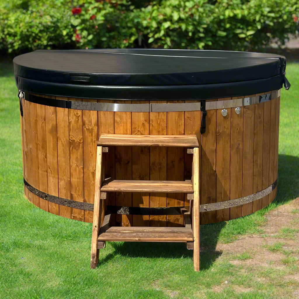 Chaque baignoire est dotée d'un revêtement en fibre de verre durable, disponible dans une gamme de couleurs, et d'une finition en pin personnalisable selon votre style. Notre escalier standard à trois marches offre un accès facile, mais si vous souhaitez une baignoire plus grande, plus large ou au design unique, nous serons ravis de la créer pour vous.