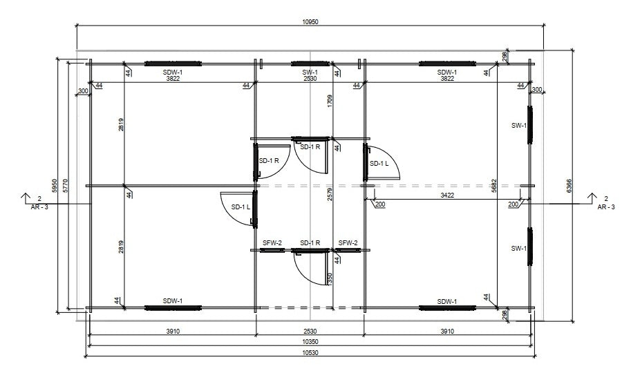 2 × Fixed spruce windows SFW-2 (571 × 606 mm)3 × Standard spruce windows SW-1 (886 × 1281 mm)4 × Double spruce windows SDW-1 (1326 × 1281 mm) |
