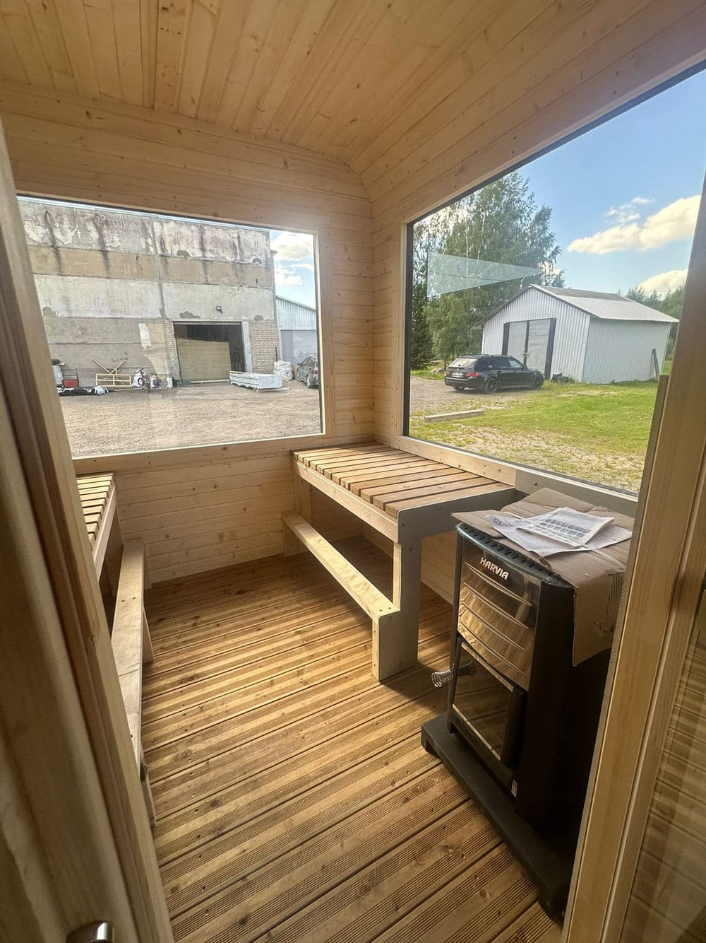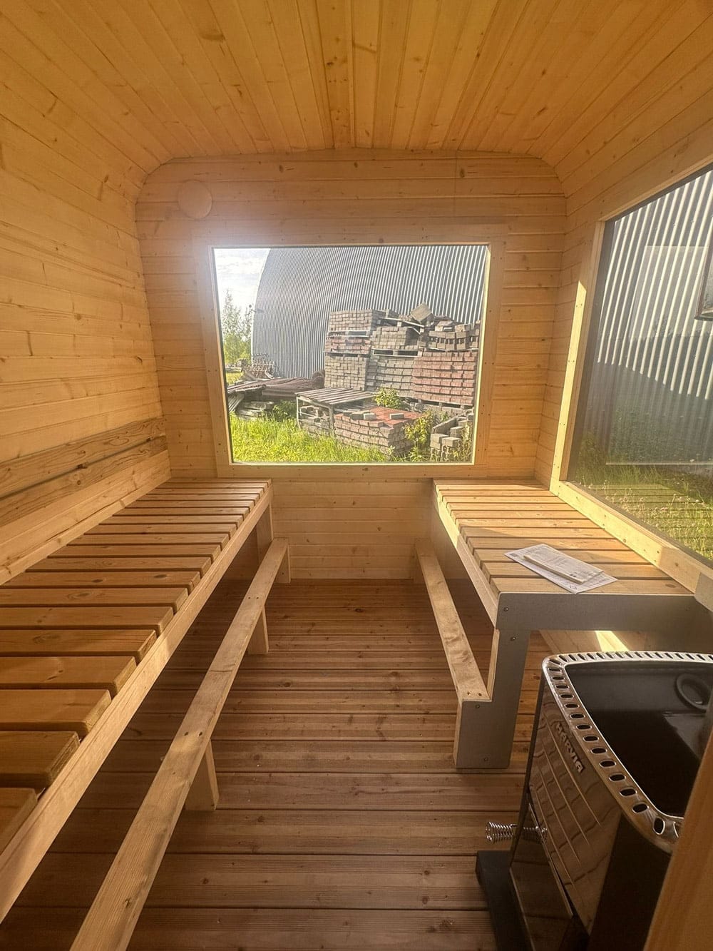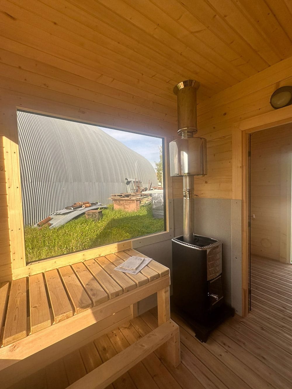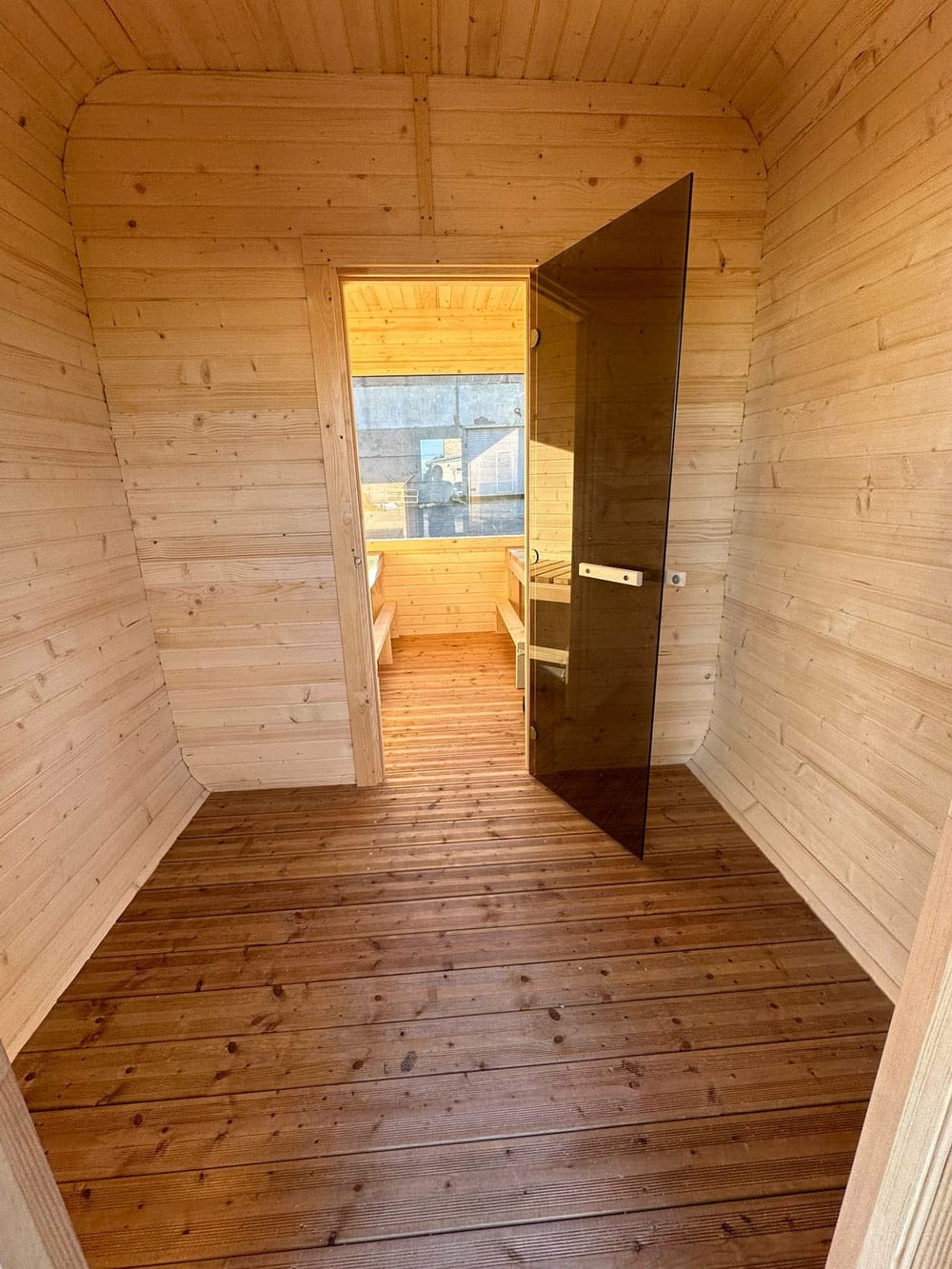 Whether it’s a quiet evening for two or a joyful gathering of friends, this sauna’s heart lies in its high-quality HARVIA wood-burning stove, known for reliable performance and soul-warming heat. Natural light spills in through two large tempered glass windows, creating a connection to the world outside—without ever breaking the sense of escape within.