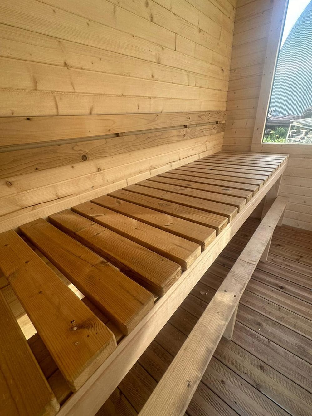 • A functional space to pause, change, or sip tea before or after your sauna session