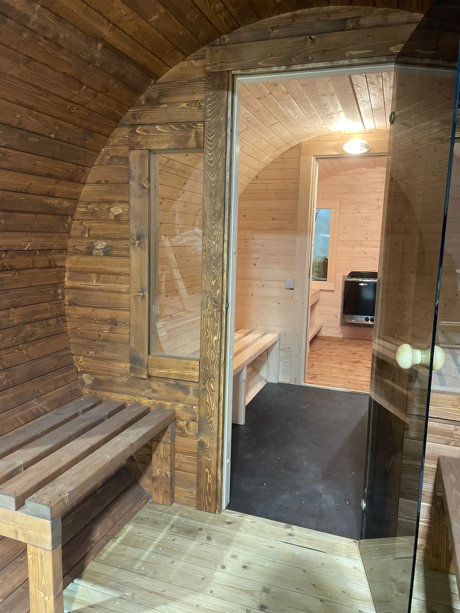 The total length of this beauty, including the cozy terrace, is 5 meters, with a generous diameter of 2.4 meters. Inside, you'll find a spacious 2-meter sauna room that comfortably welcomes up to 8 people, a 2-meter relaxation room for cool-downs or conversations, and a 90 cm terrace to enjoy fresh air between sessions.